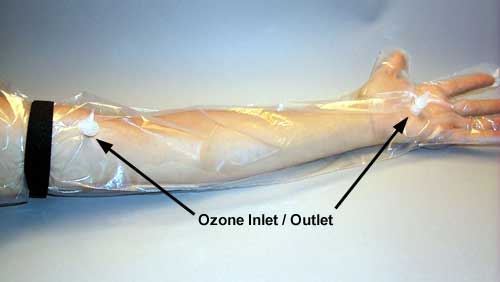 Bagging a limb requires only a plastic bag in order to confine the ozone to the area being treated. The limb is moistened first, (in order to aid the penetration of ozone through the skin) then enclosed in the plastic bag and the ozone is introduced by means of silicone tubing from the generator into the bag. The top of the bag is securely closed with either a cloth strip or an elastic strap as a cuff This technique has been in use for many years, and is especially useful with impaired circulation in diabetic legs (removing the threat of amputation) also very effective for the treatment of arthritis, rheumatism, ulcers, burns, wounds and bruises etc.