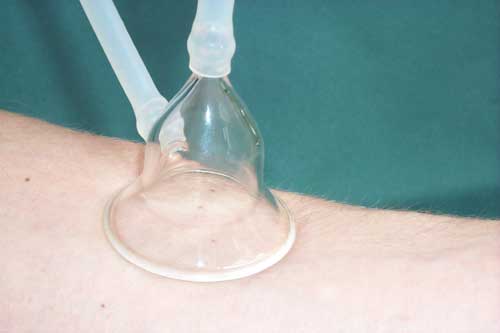 Cupping with a funnel is a more recent transdermal technique where ozone is introduced into a very restricted area at a very low flow rate. First the area to be treated (typically the breast, liver, pancreas, spleen, intestine, kidney or adrenal) is wet with a warm wash cloth, and then the plastic funnel is held firmly over the area. Excellent results are obtainable with this technique, especially with hepatitis, diverticulitis, pancreatitis, kidney infections, adrenal insufficiency, varicose veins, port wine stains, stretch marks and scars. This method can be applied whilst sitting in the sauna cabinet, or on its own.