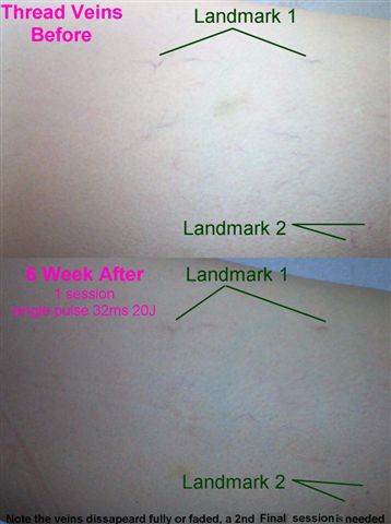 Thread veins Treatment before & 6 weeks after 1 session. Note the veins have fully disappeared or faded. 1 more session will be required. |